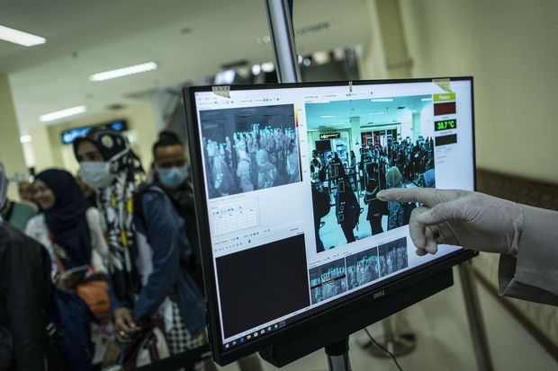 보건 당국자는 여행자들을 인도네시아 술탄 이스 칸 다르 무다 국제 공항의 열 화상 모니터로 감시합니다. 사진 : ZIKRI MAULANA / ZUMA PRESS