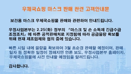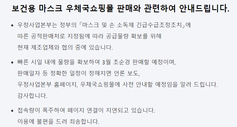 보건용 마스크 우체국쇼핑몰 판매와 관련하여 안내드립니다. 우정사업본부는 정부의 「마스크 및 손 소독제 긴급수급조정조치」에 따른 공적판매처로 지정됨에 따라 공급물량 확보를 위해 현재 제조업체와 협의 중에 있습니다. 빠른 시일 내에 물량을 확보하여 3월 초순경 판매할 예정이며, 판매일자 등 정확한 일정이 정해지면 언론 보도, 우정사업본부 홈페이지, 우체국쇼핑몰에 사전 안내할 예정임을 알려 드립니다. 감사합니다. 접속량이 폭주하여 페이지 연결이 지연되고 있습니다. 이용에 불편을 드려 죄송합니다.