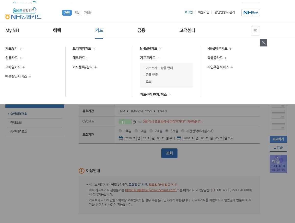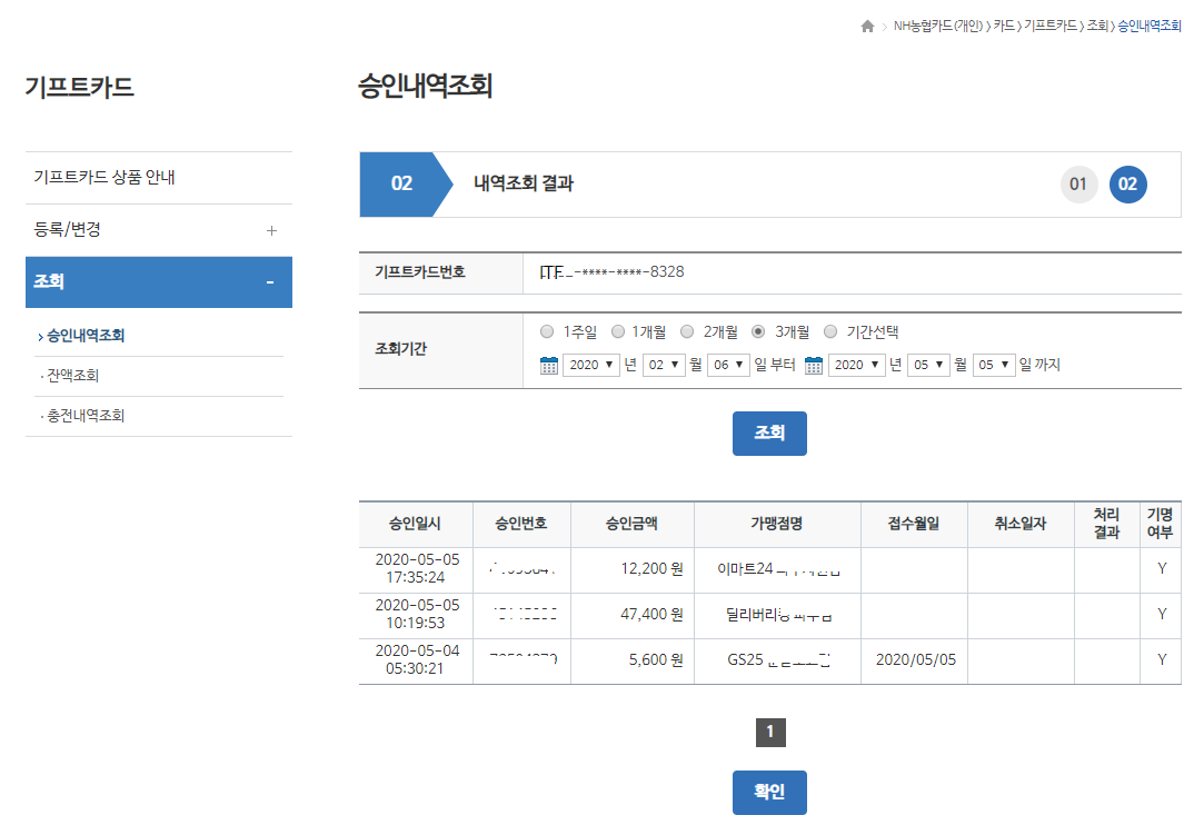 농협카드 홈페이지의 [카드] 탭 - [기프트카드] - [조회]를 누르시면 좌측에 승인내역,잔액,충전내역 조회가 가능합니다.