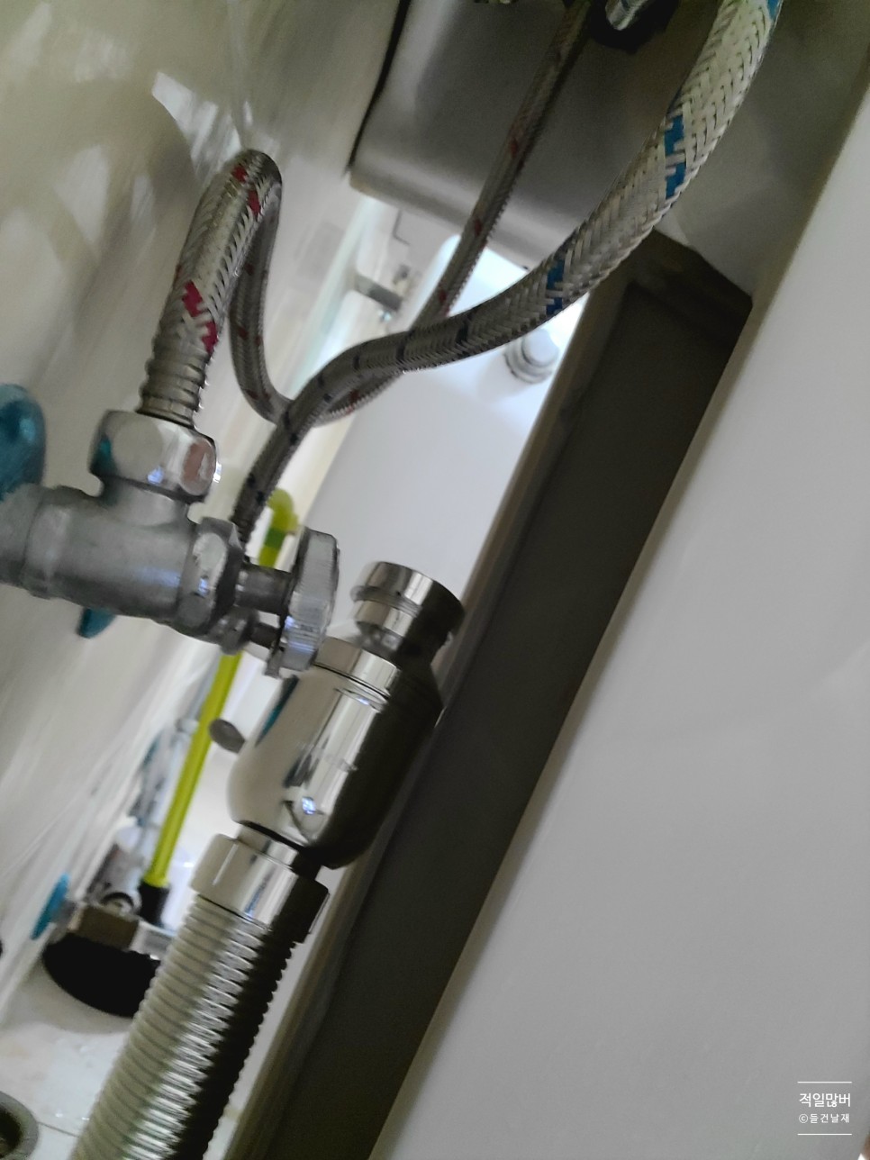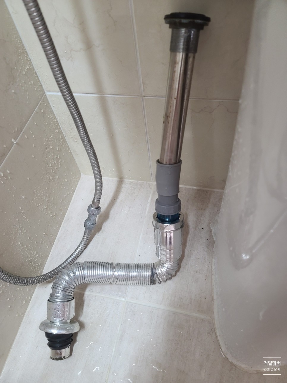 트랩을 하수관과 연결했을 때 모습인데 세면대까지 거리가 꽤나 있어 보인다.