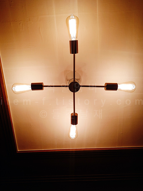 사진에 사용된 전구는 에디슨 전구(필라멘트 전구) 60W 시중에서 5천 원 정도에 판매한다.