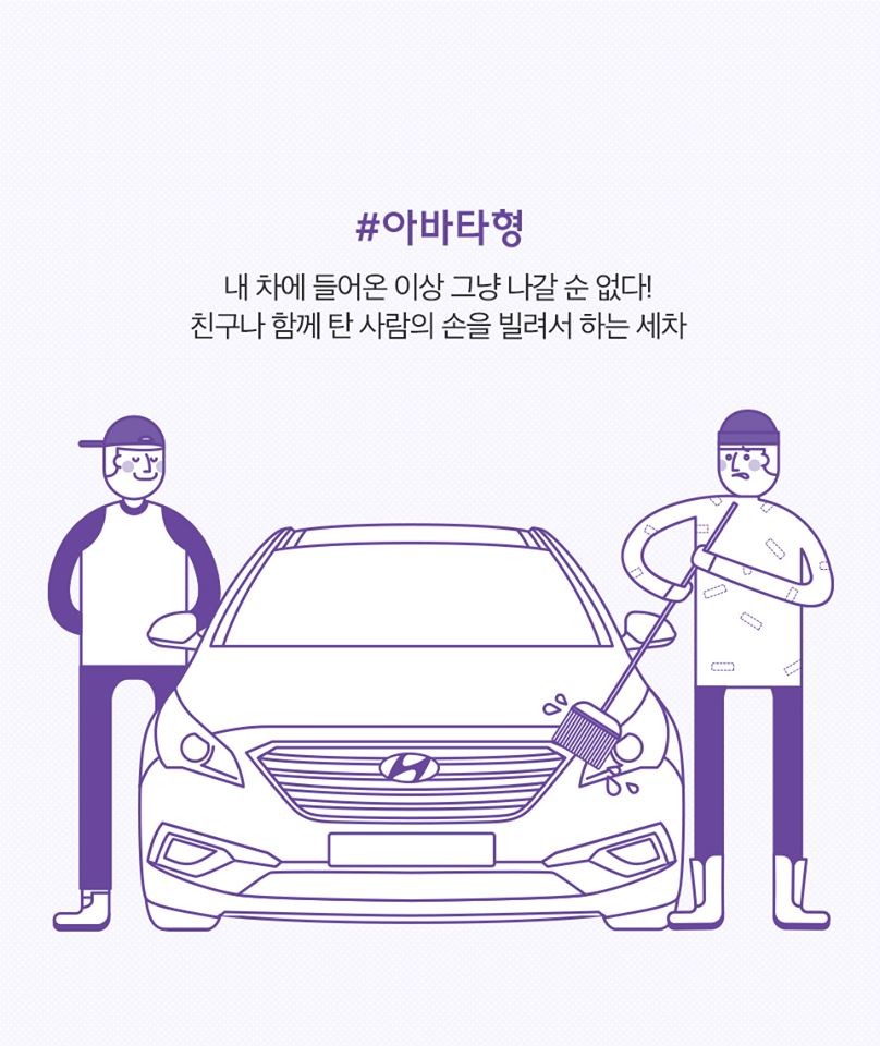 다섯 번째 세차 유형, 아바타형. 자신의 차를 탄 동승자를 적극 이용하는 아바타형은 친구나 함께 탄 사람의 손을 빌려 자동차 세차를 합니다.